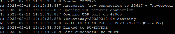 mcedit ~/test/YSFClients/YSFGateway/YSFGateway.ini [General] Callsign=ваш_позывной Suffix=ND Id=ваш_dmr-id .... Daemon=0 [Log] .... FilePath=/tmp FileRoot=YSFGateway .... [Network] Startup=RU-KAVKAZ .... [YSF Network] Enable=1 Port=42000 #Hosts=./YSFHosts.txt Hosts=/home/pi/test/YSFClients/YSFGateway/YSFHosts.txt .... [FCS Network] Enable=0 ....