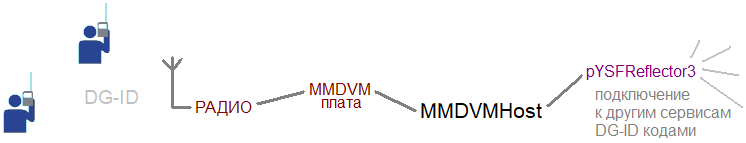 Мы подключаем MMDVMHost к рефлектору который (в свою очередь) понимает DG-ID коды, так мы можем подключить каждую комнату (в пределах этого рефлектора) к любому внешнему сервису.