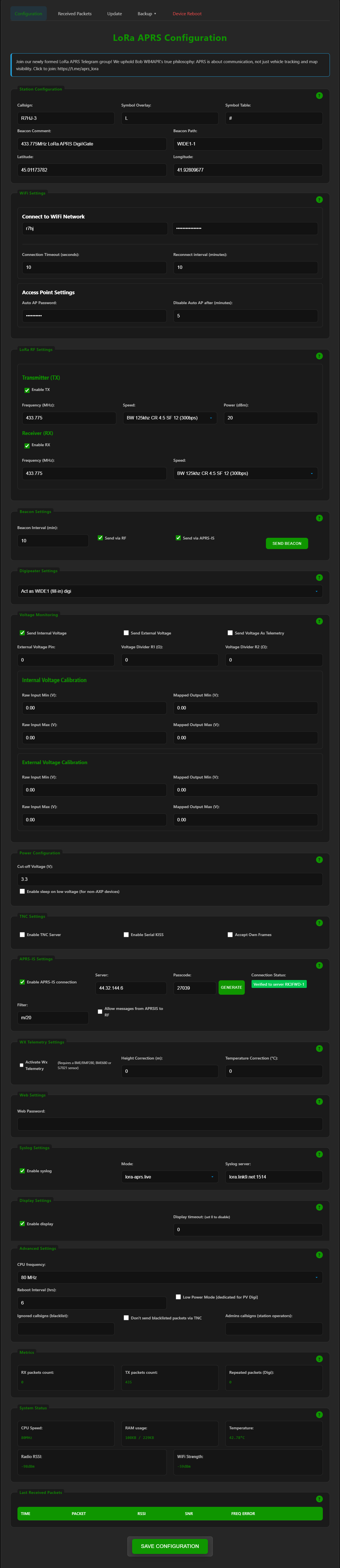 Зелёная звезда, буква L и позывной-3, говорят нам о том что маяк передан в формате LoRa, это дигипитер, у которого rx/tx на одной частоте. Хотя, режим iGate или RX-iGate также может быть активированна, но в первую очередь это дигипитер, а остальной функционал является дополнением.